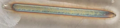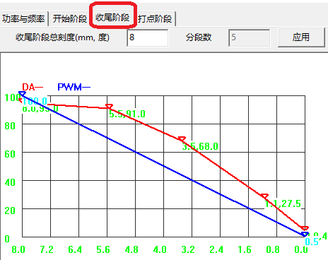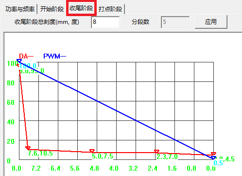 光纖激光的功率用0~10V電壓(或者0~4V)控制,但當DA電壓增大或者減小時,功率不能立即增大或減小,當焊接收尾關激光時,如果激光功率很大時突然關光,收尾處會出現一個小坑。解決這一問題的辦法:增加收尾段的長度(一般設置8~10mm),拉低收尾段DA和PWM曲線,使激光功率降低后再關激光。圖1為收尾段激光功率緩降波形設置,其中紅線為DA電壓,藍線為PWM占空比。圖a 正確設置; b 電壓下降太快,造成收尾段沒有激光,收尾前有坑;c 電壓下降太慢,激光功率降不下來,收尾有坑。