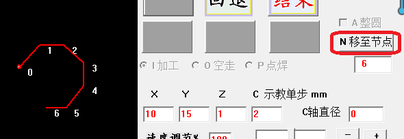 如果示教生成的零件加工程序還有偏差,可以再點示教編程進去修正軌跡,進入后,只能點“移動至節點”,可以一點一點按順序移動,也可以輸入節點號,直接移動到節點N。移動到各節點后,再手動移動工作臺到準確位置,然后再點“移動至節點”往后移動。校準后點結束就可以了。